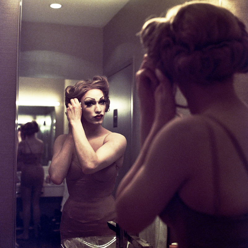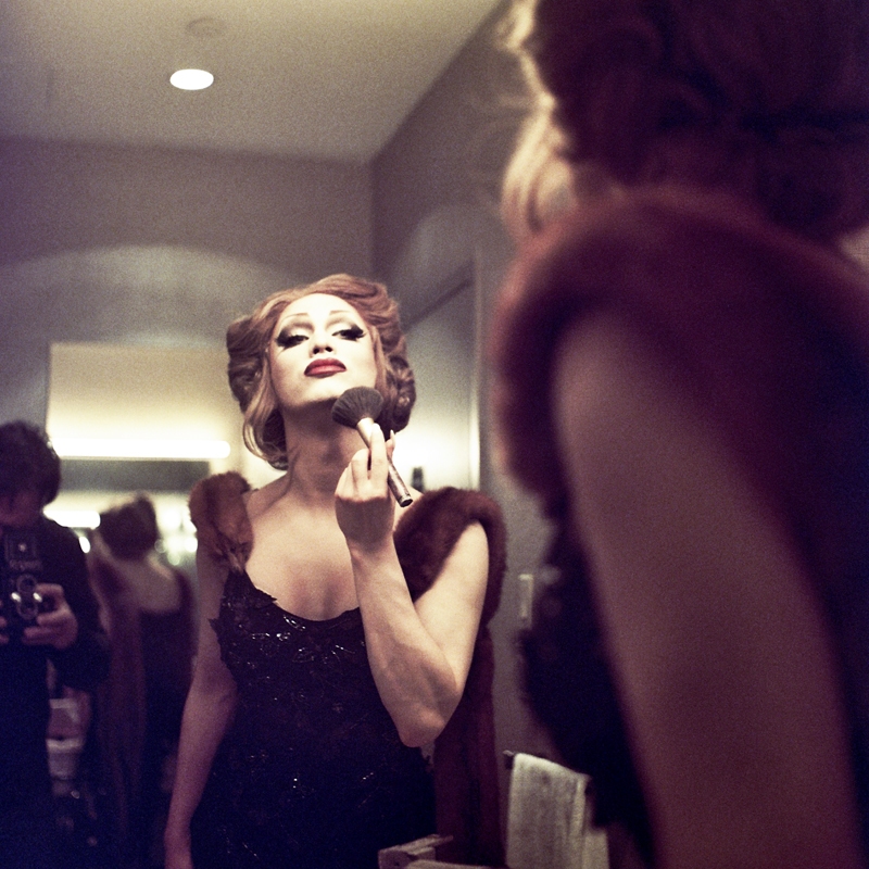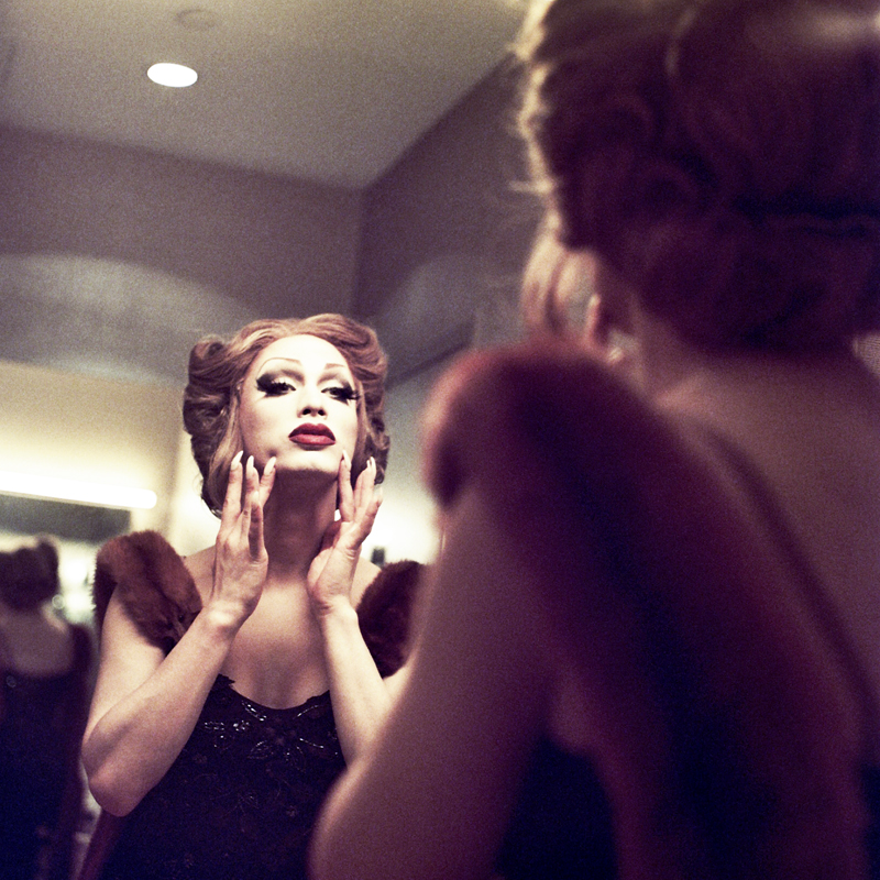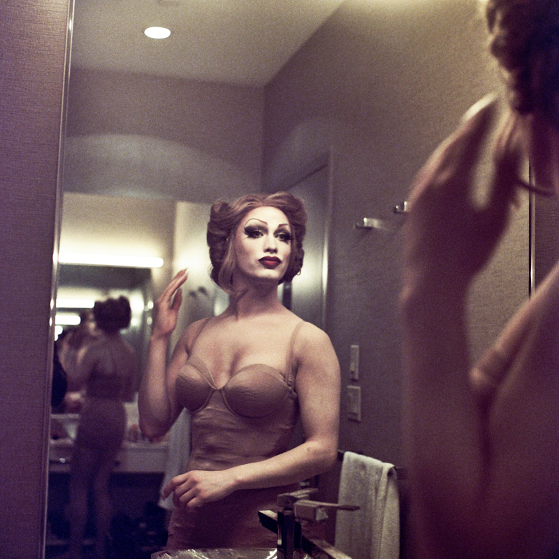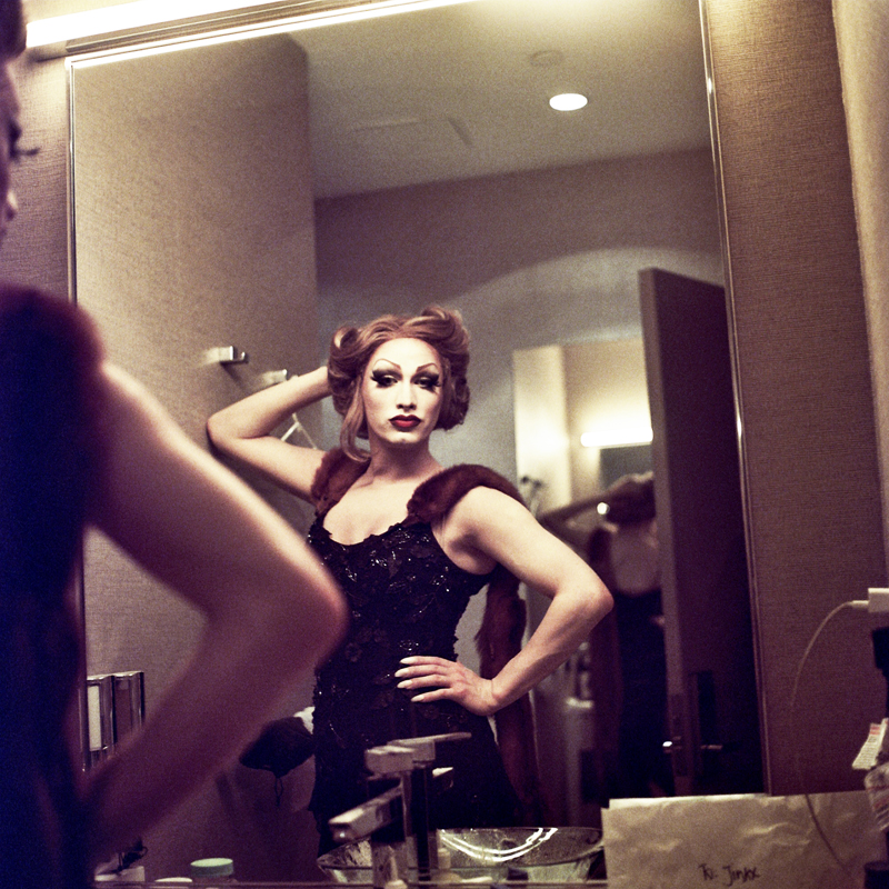 The hotel room where Jinkx was preparing for her show (and I was meant to photograph her) was super tight, like a railroad sleeping car with a little nook at the end where the make-up mirror was. There was no space to set up a light or have Jinkx lounging in the bed for the shot I pre-imagined taking. Instead I had to open the front door of the room and stand in the hallway and point my camera lens back into the room in the mirror where Jinkx was making up to take a picture.