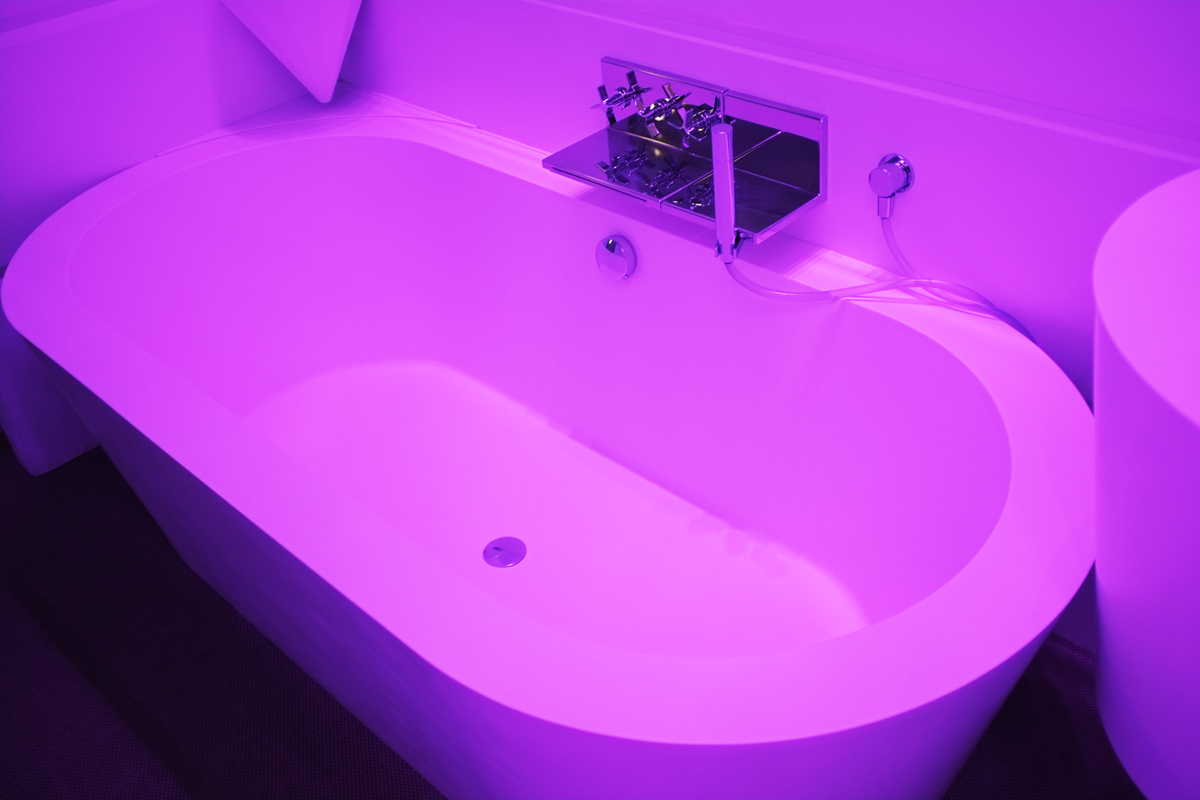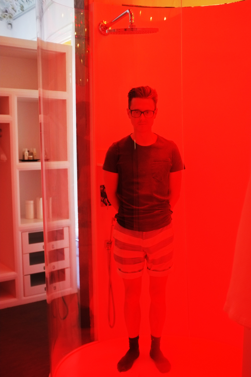 Welcome to the chromo shower. Chromotherapy is a “complementary medicine“ method. Trained chromotherapists claim to be able to use light in the form of color to “balance energy wherever a person’s body be lacking, whether it be on physical, emotional, spiritual, or mental levels.” I didn’t know chromo showers existed before my visit to the El Palauet, and while it didn’t make me want to rush out and install one in my apartment, it was very relaxing. Above is me in my green phase.