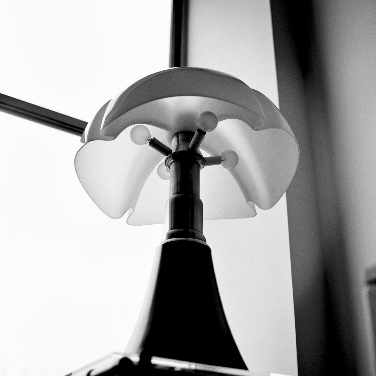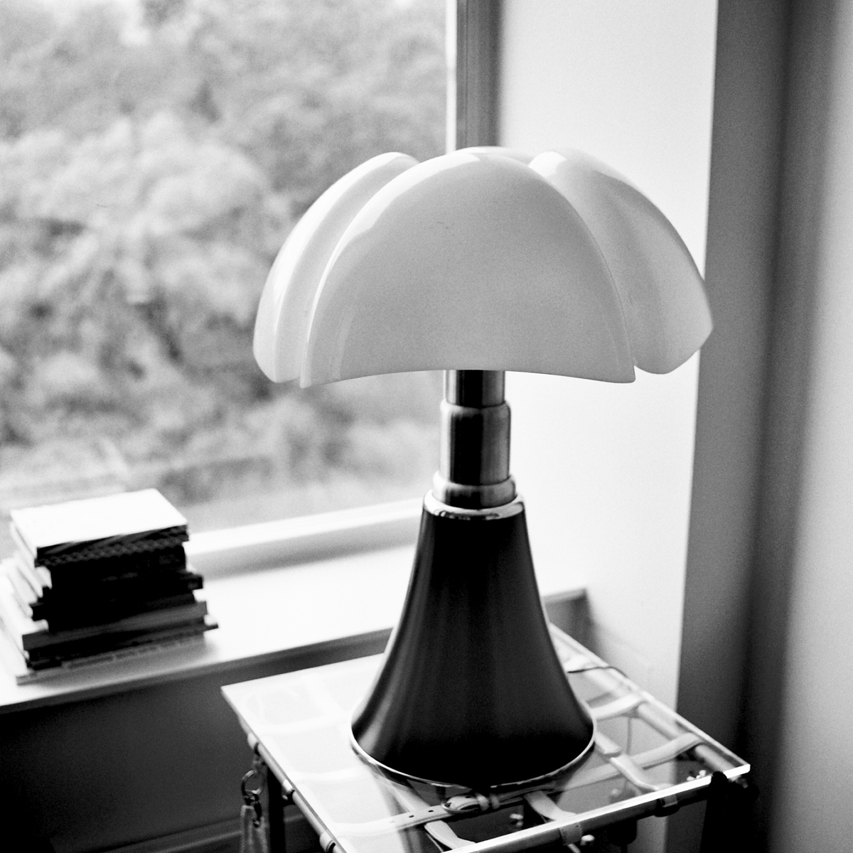Pipistrello lamp by Gae Aulenti on table by Paul Kopkau.