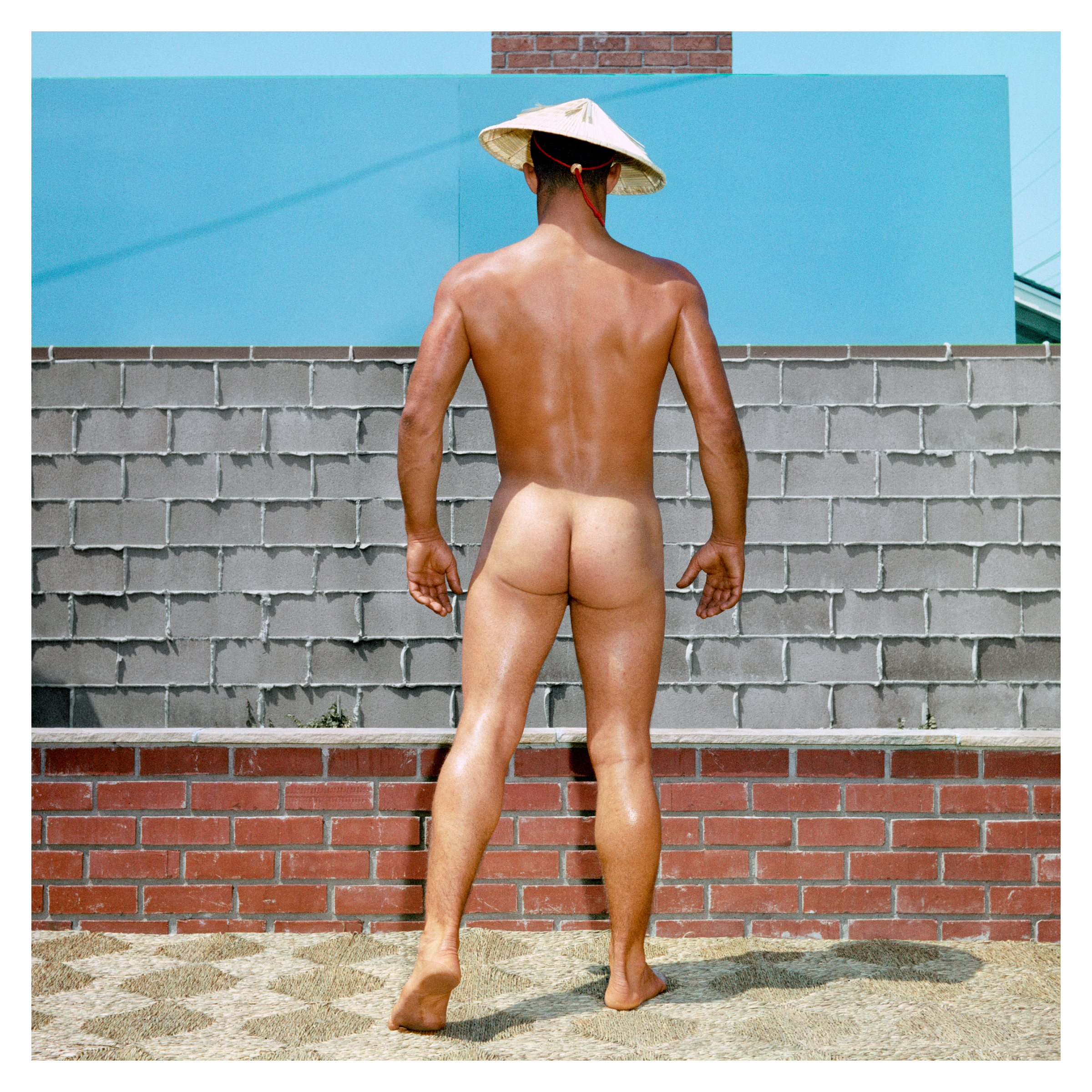 I’ve had this book in my space for months, it’s so big! I’d take it out, put it on my desk, open it, close it, put it back on the archival shelf for a few weeks then take it out again. This dance went on for months until spring arrived — suddenly it seemed like the right time to have a look at all the luscious, nubile men rendered in brightly saturated technicolor. It’s quite massive with over 45 color plates shot “en plein air” and almost sixty shots from the studio. The classic physique work finds the models brightly lit, well-oiled and nude in some cases; yes full frontal nude! There are few props in the images, a stool, a column, a plastic ball, a cowboy hat and settings that included brightly colored backdrops in the studio or scenes in nature.