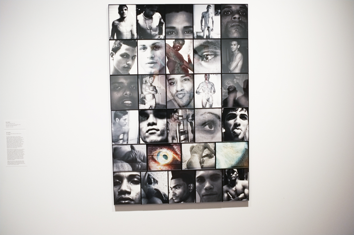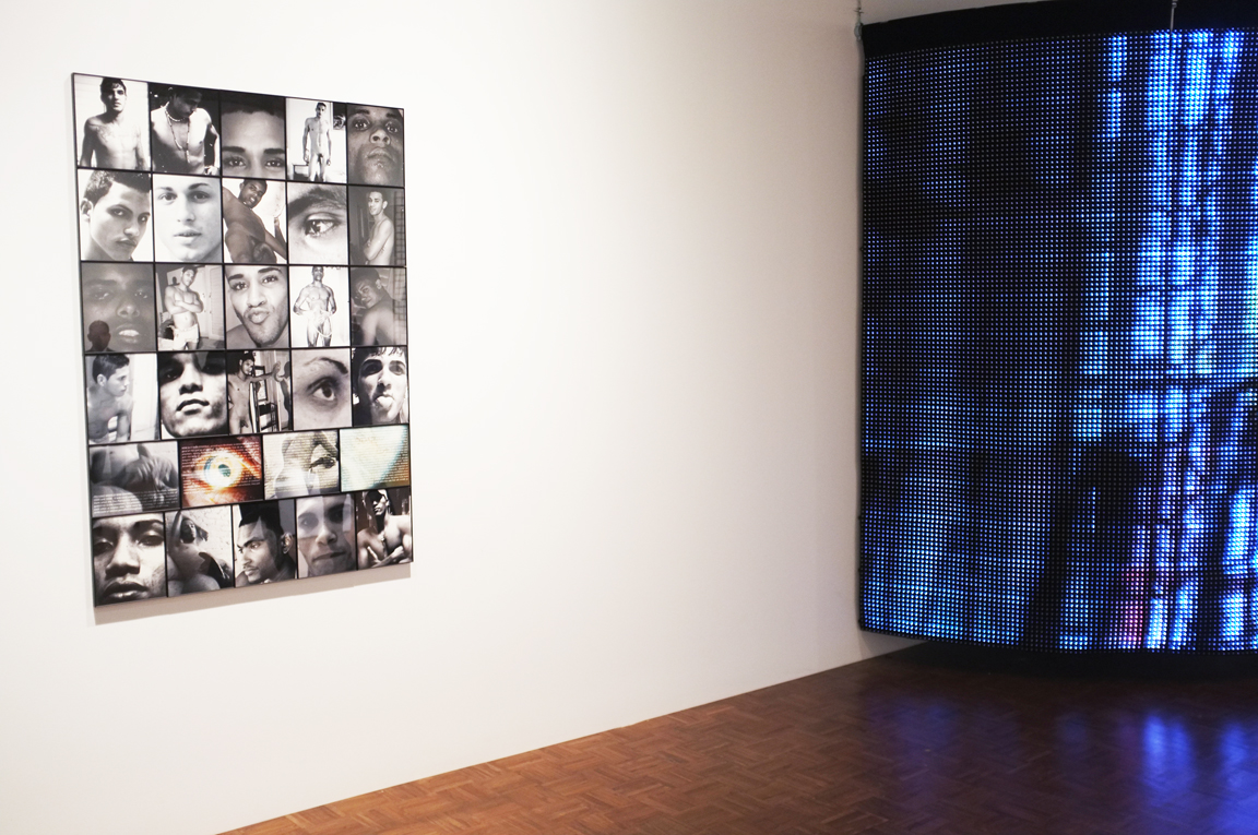 We went the opening week and still remember some of the works, well the ones that stood out to us. Here’s a taste of what we liked: Gary Indiana‘s grid of images and LED curtain. The grid is filled with photos of delicious men and their bodies, you even get to see penises.