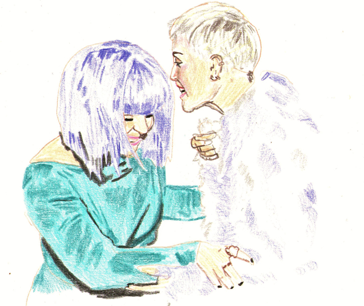 Miley and Kelly Osbourne. We meet Kelly last year at a party during Art Basel, she is way different in real life than she is on Fashion Police. In real life she has a total potty mouth. She was talking so much trash to us about some girl who used to date her boyfriend. At one point I believe the phrase “smash her head in” was uttered. Cute hair.