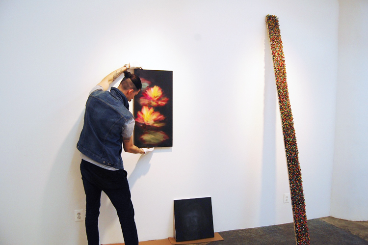 Logan installing paintings by Ross Bleckner, and a long narrow sculpture by Gina Dawson.