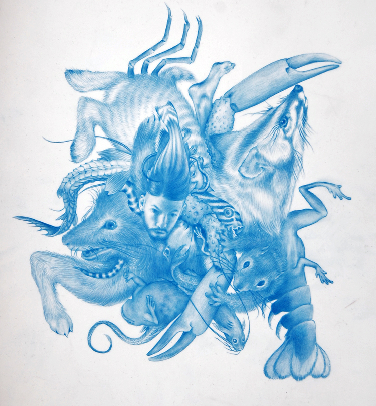 Why are all the drawings in this exhibition done in blue pencil on mylar? There is one large work in pastel, but the blue pencil works have a sort of magical feeling to them… I use imagery that is naturalistic or based on biological anatomical studies, and transform or mutate them, so the monchromatic colour makes them otherworldly… the image for the invite “Swarm” is the only anatomically naturalistic drawing in this suite of blue drawings, the rest I describe as collage-esque, if that makes sense…